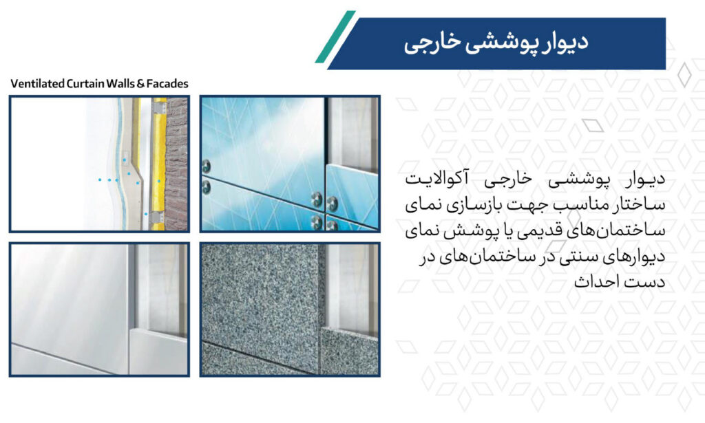 • اجرای آکوالایت در دیوارهای خارجی علاوه بر نصب سریع و آسان این امکان را می‌دهد که با انواع پوشش‌های بافت‌دار یا آجرپلاک و یا رنگ سطح نهایی ارزنده‌ای را به دست آورد.